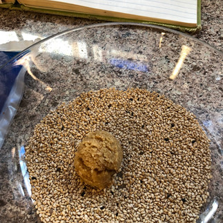 With one hand, scoop a one-inch ball of dough and plop it onto the sesame seed plate. With the other hand, roll it around with minimal handling, and then put it on the ungreased cookie sheet. Continue until all the dough is used. The cookies don’t spread, so you can pack them tightly. I prefer a hexagonal close-packed (HCP) arrangement, like silicon atoms in graphite. Square arrays are also fine (like NaCl) if you can get that structure to accommodate all biscuits on one sheet. I couldn’t.